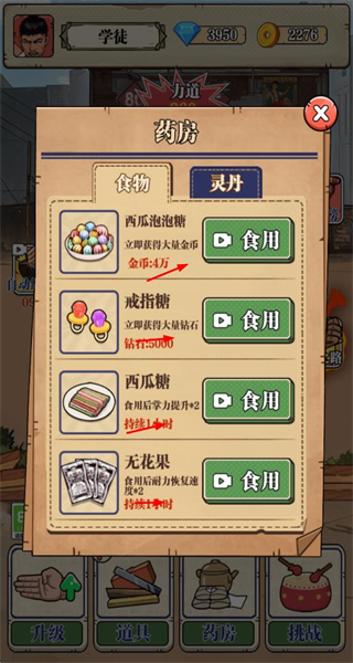 4、在药房界面,消耗金币食用食物类道具,可获得金币加成等增益,提升资源获取速度。