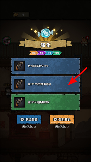 2、获得强化机会后,在强化界面点击红色箭头指向的减少10%的换弹时间选项,提升武器的操作效率,增强战斗能力。