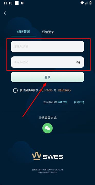 3、在登录页面填写账号和密码,勾选协议后,点击登录完成账号登录操作。