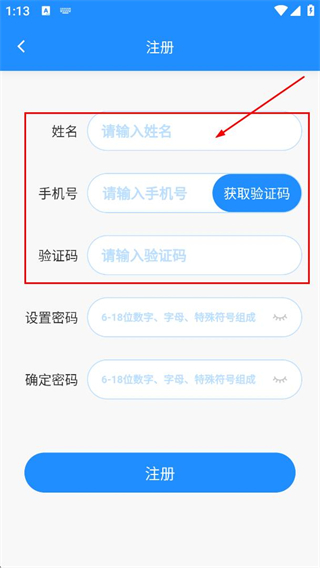 2、在注册页,填写姓名、手机号,点击获取验证码后,填写请输入验证码。