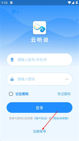 1、在云听说登录页,点击注册账号的选项,进入注册页面。