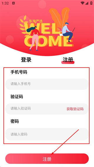 4、填写手机号,点击获取验证码后填验证码,再填写密码后,点击注册。