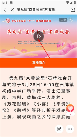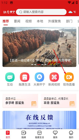 1、在独秀怀宁首页点击现场直播选项,进入现场直播页面。