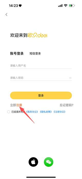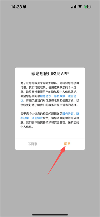 1、阅读欧贝APP的服务相关协议后,点击弹窗中的同意,进入应用。