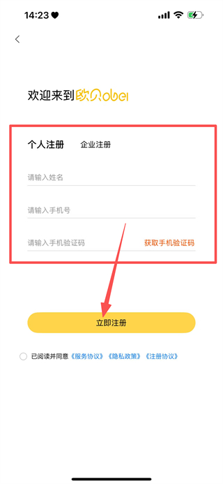 4、填写姓名、手机号,获取验证码后填验证码,点击立即注册,完成注册。