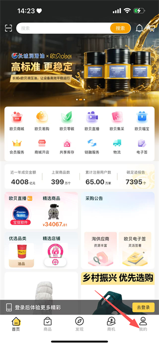 2、在欧贝APP首页,点击底部导航栏的我的选项,进入个人中心页面。