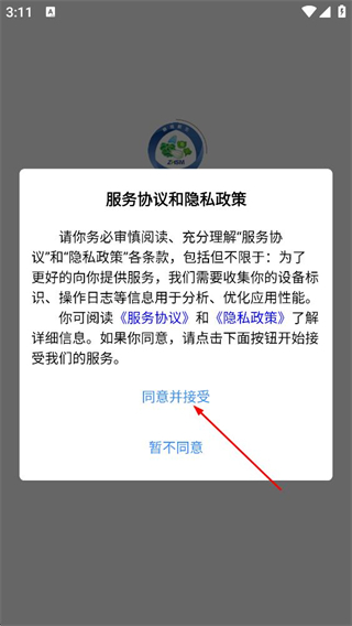 1、阅读服务协议和隐私政策后,点击同意并接受,进入应用。
