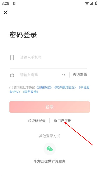 3、在密码登录页,点击新用户注册选项,进入注册页面。