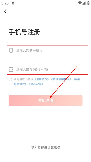 4、在注册页,填写手机号,选填推荐码,点击立即注册。