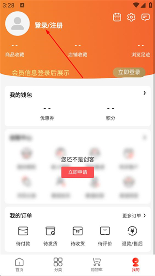 2、在个人中心页面,点击登录/注册区域,进入登录页面。