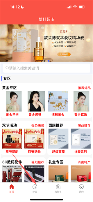 1、在博科超市首页点击底部分类选项,进入产品分类页面。
