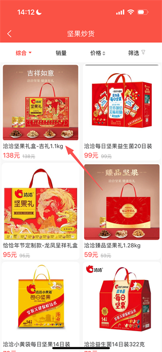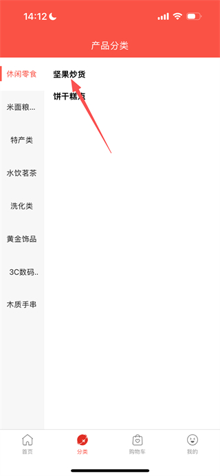 2、在分类页面选择目标类别如坚果炒货,进入对应商品列表页。