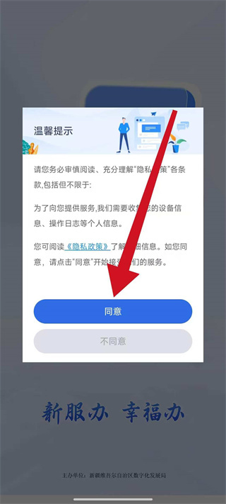 1、打开新服办,在弹窗中点击同意,进入应用首页。