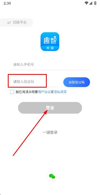 2、在登录页面填写手机号,勾选协议后,点击获取验证码。