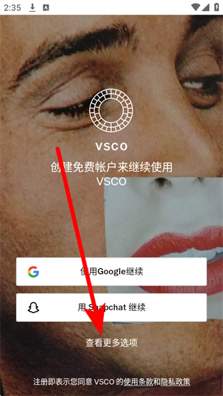1、打开VSCO,在初始注册页面点击查看更多选项,展开更多注册方式。