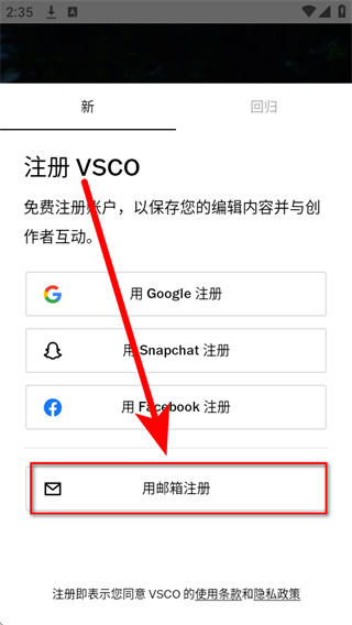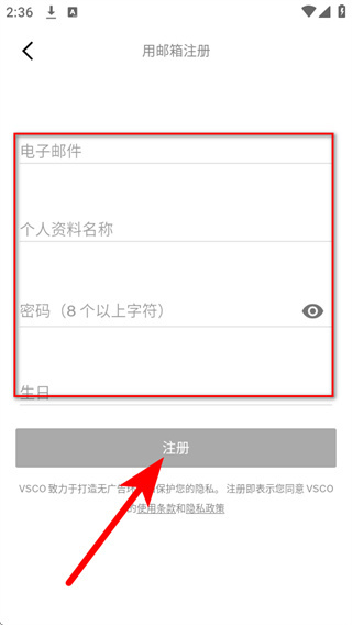 3、在邮箱注册页面,依次填写信息,确认内容填写完整后点击注册,完成VSCO账号注册。