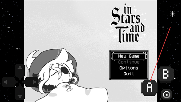 1、进入在时光与繁星中的启动界面后,可通过A键选择NewGame开始新局,也能选Continue续存或Options调整后再操作。