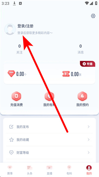 2、在个人中心页面,点击登录注册区域,进入登录选择界面。