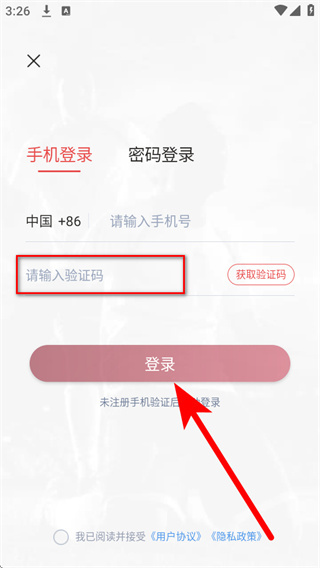 4、将收到的短信验证码填入验证码框,勾选相关协议后,点击登录完成账号登录。
