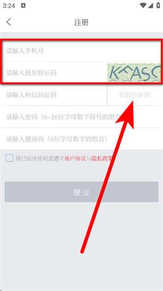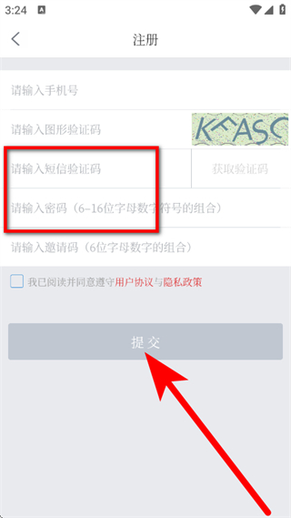 5、输入短信验证码,设置密码,勾选后,点击提交,完成账号注册。