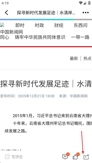 2、在新闻详情页面点击分享图标,打开分享选项菜单。