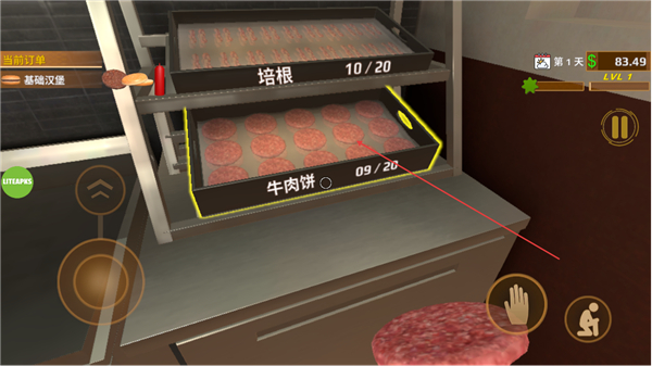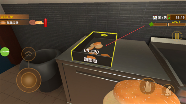 2、前往操作台,取用面包作为基础汉堡的底层食材,推进制作流程。