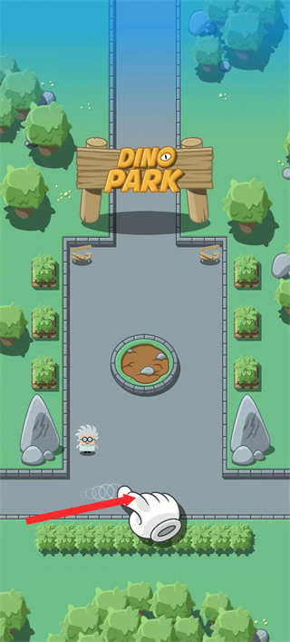 1、进入恐龙公园界面后,点击红色箭头指向的区域,触发初始引导流程,这是开启公园经营玩法的关键操作。