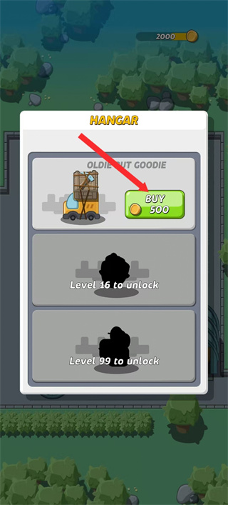 3、在机库界面里,点击红色箭头指向BUY按钮,消耗500金币购买载具,解锁公园的物资运输能力,推进经营进度。