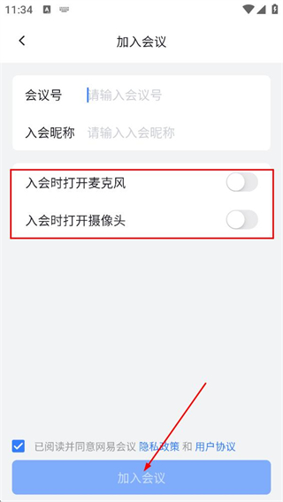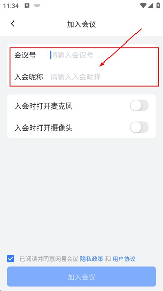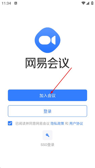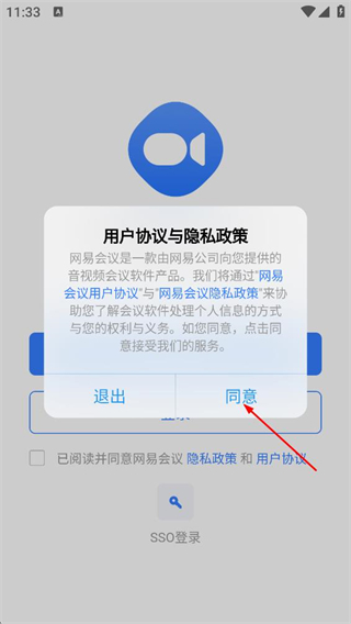 1、阅读网易会议用户协议和隐私政策后,点击同意,进入应用。