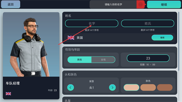 2、进入车队经理创建界面后先在名字和姓氏输入框填写信息,还可点击编辑调整国家等属性,完成后准备推进下一步。