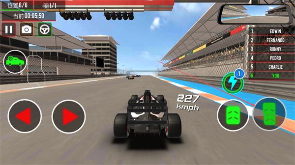 3、在赛道直道使用加速键右侧蓝色图标提升速度,弯道时减速控向避免冲出赛道。