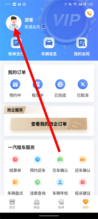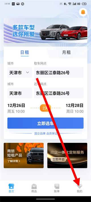1、打开一汽租车,在首页,点击底部我的,进入个人中心页面。