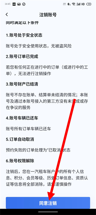 4、在注销账号页面,确认满足所有注销条件后,点击同意注销。