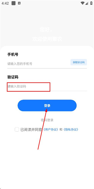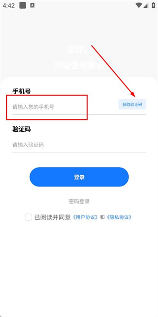 2、在手机登录页面填写手机号,勾选协议后,点击获取验证码。