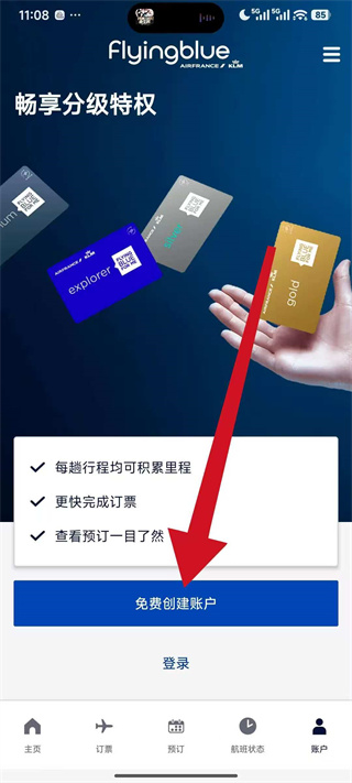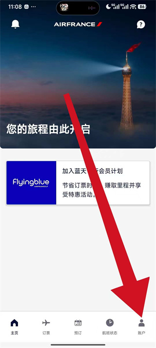 1、打开法国航空,点击底部导航栏的账户,进入账户相关页面。