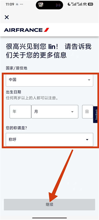 4、在很高兴见到您,选择国家居住地,填写出生日期、选择称谓,点击继续。