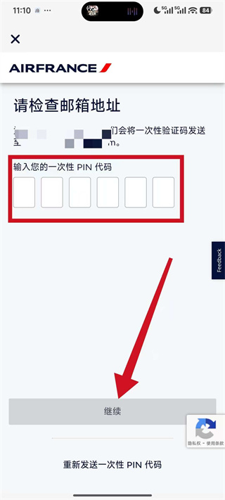 6、在邮箱地址页面,输入邮箱收到的一次性PIN代码,点击继续,完成账户注册。