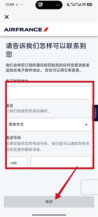 5、在联系方式页面,填写电子邮箱地址、选择语言、填写电话号码,点击继续。