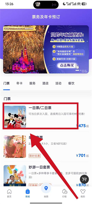 3、在票务页面的门票分类下,选择目标门票类型,点击进入该门票的详情页面。