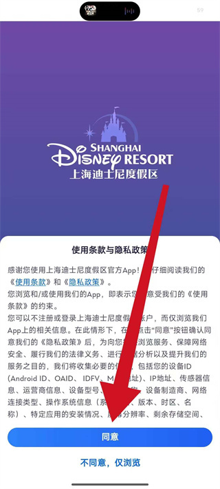1、打开上海迪士尼,在弹出的弹窗中点击同意。