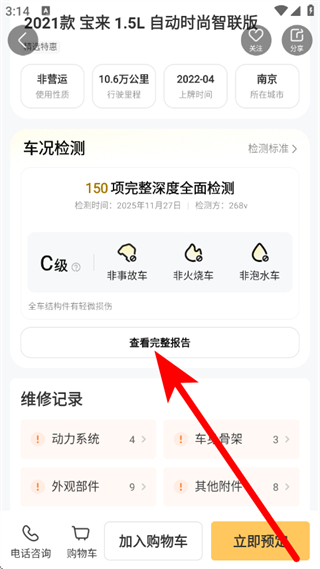 3、在车辆详情页面,点击查看完整报告,进入验车报告页面。