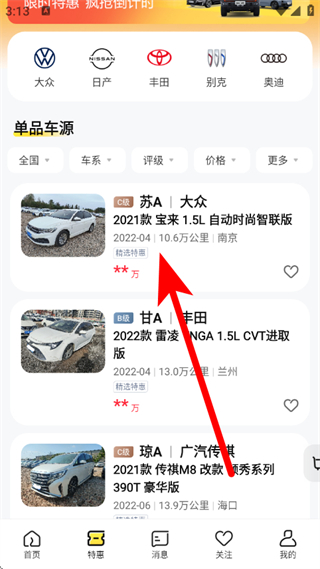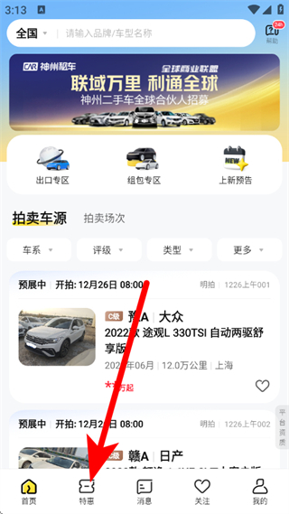 1、在神州二手车的首页页面,点击底部特惠,进入单品车源页面。
