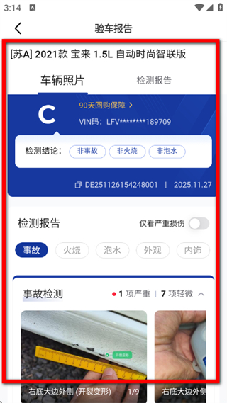 4、在验车报告页面,查看车辆的检测结论、事故检测等详细车况信息。