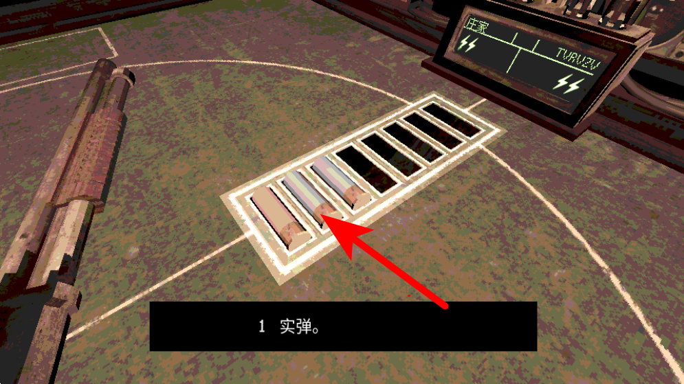 1、进入游戏环节后,查看红色箭头指向的弹槽,了解当前实弹数量如1实弹,这是参与轮盘玩法的前置信息确认操作。