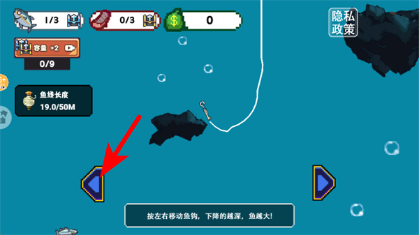 1、钓鱼时依照红色箭头指引,操作左右按钮移动鱼钩,同时下放鱼线鱼线越深越易钓大鱼,提升捕鱼成功率。