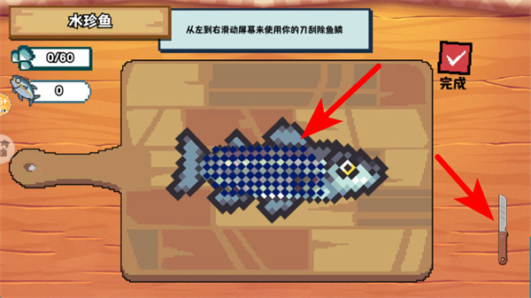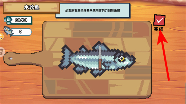 2、进入刮鱼鳞环节后,跟随红色箭头提示,拖动刀具从左到右滑动屏幕,完成水珍鱼的鱼鳞清理操作,积累进度。