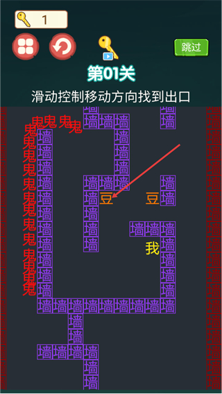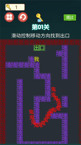 2、当前是第01关,依据提示左右上下滑动,控制角色移动,操控我避开墙并躲避下方鬼的追击,目标是找到出口推进关卡。