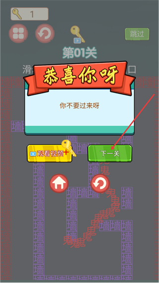 4、通关后弹出含恭喜你呀的提示框,点击下一关即可进入后续的游戏关卡进程。
