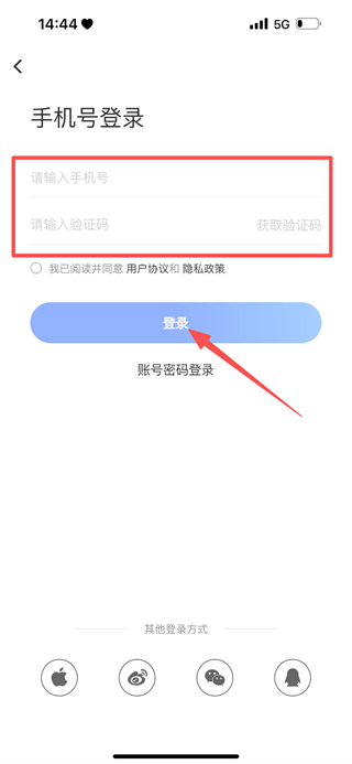 4、在手机号登录页面,填写手机号、验证码,并点击登录完成登录。