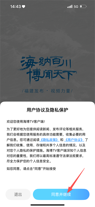1、在用户协议及隐私保护弹窗中,阅读后点击同意并继续按钮。